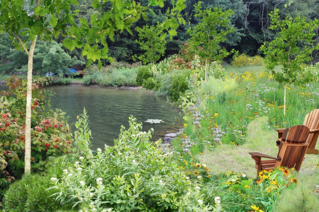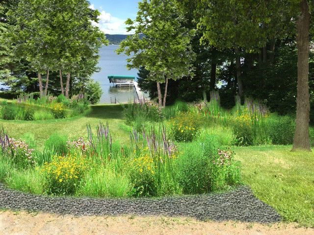 While keeping access and views, keystone species are used in stormwater practices to prevent pollution from entering the lake, like in these rain gardens, and tree plantings.